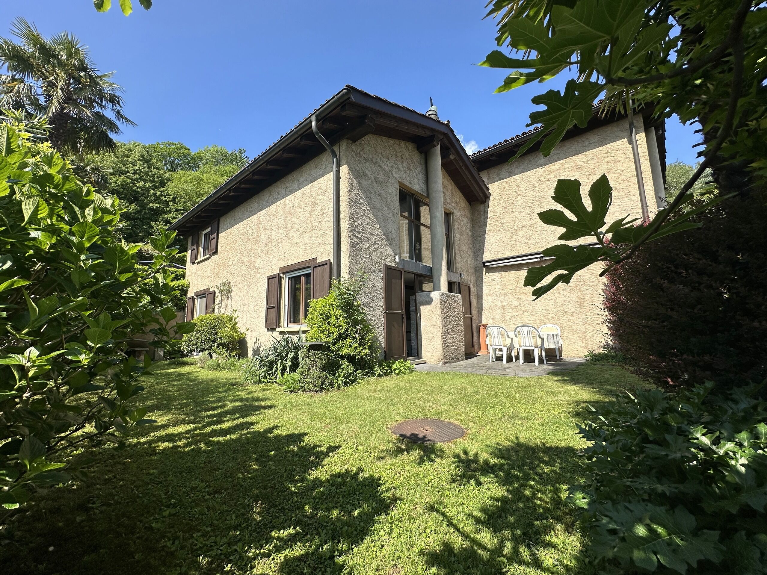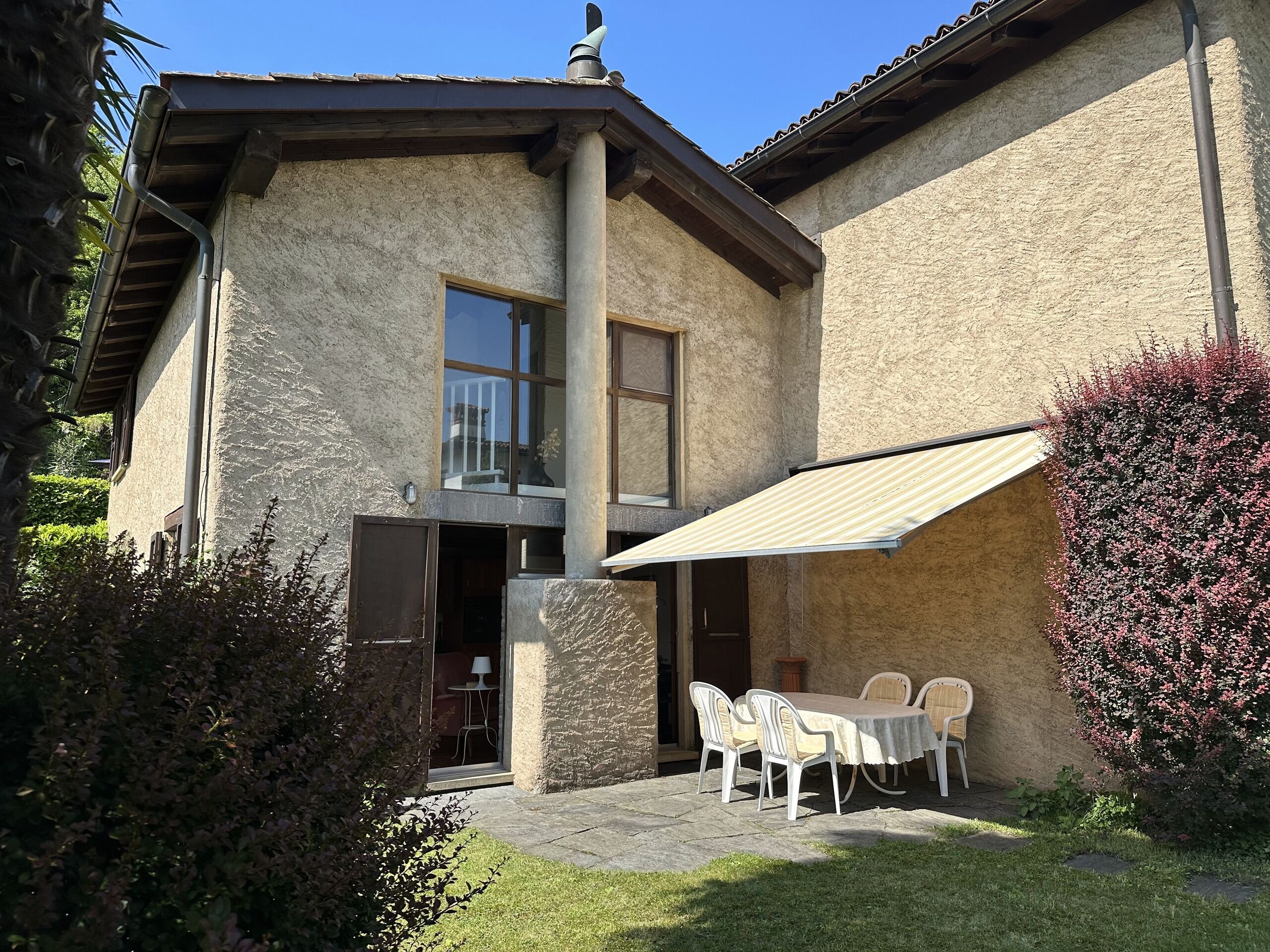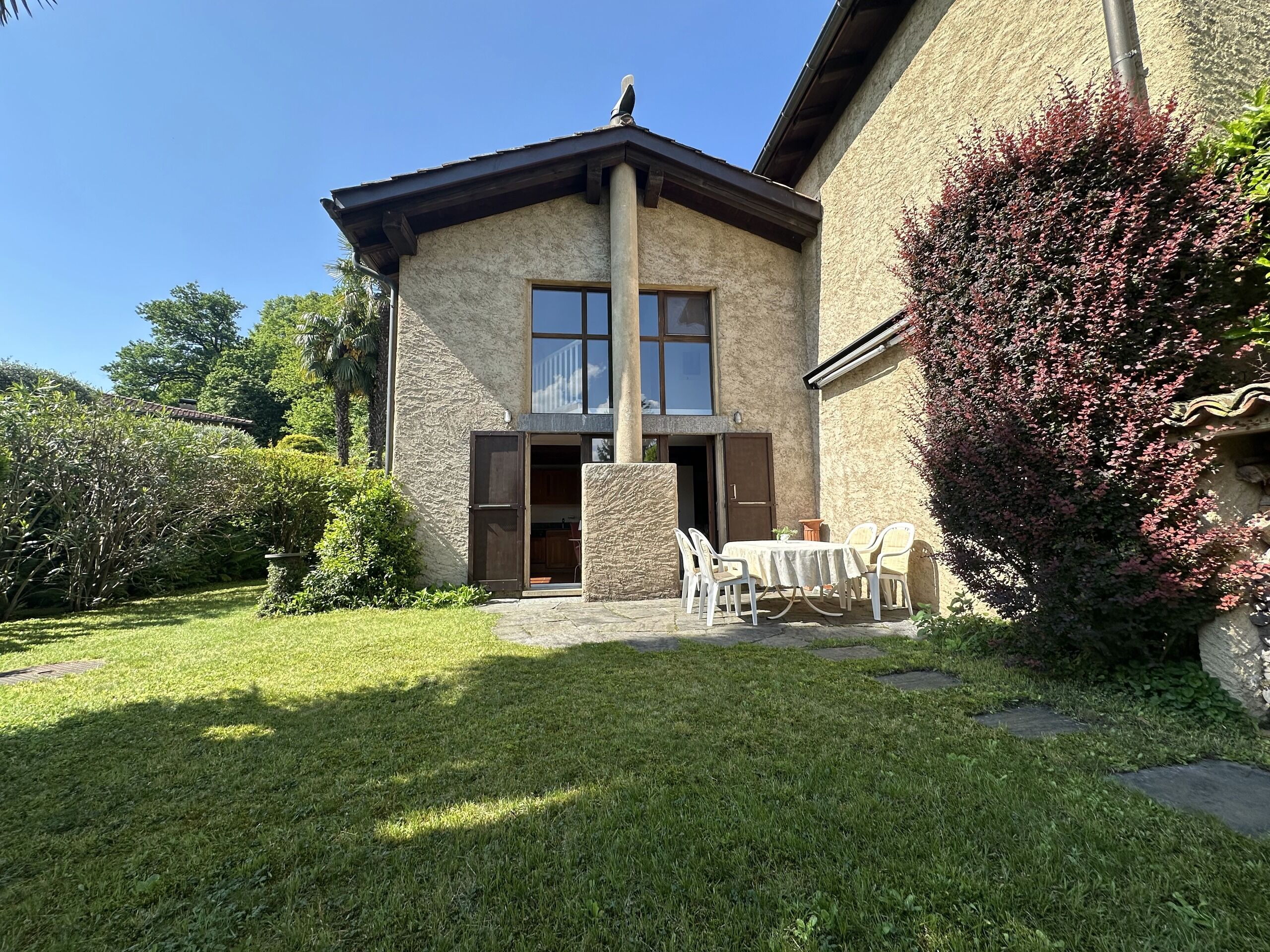 soggiorno con cucina con camino e uscita sul giardino, 1 camera letto anchâessa con uscita sul giardino, 1 bagno con doccia, locale lavanderia-riscaldamento,